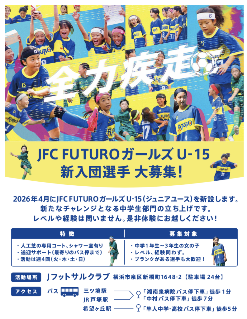 2026年4月より新設するJFC FUTUROガールズ U-15の新メンバーを募集しております!